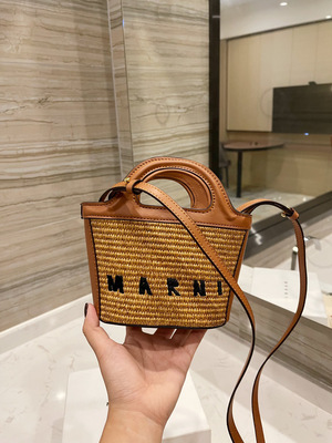 现货marni玛尼菜篮草编编织包单肩斜挎拼接牛皮水桶女包