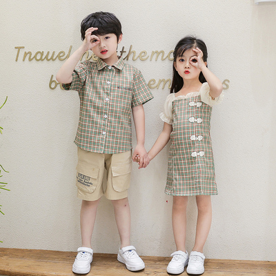 姐弟装夏天装新款男童格子衬衫女儿童改良汉服旗袍裙兄妹装亲子装